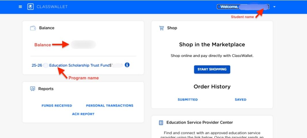 You will be brought to the dashboard, where you can view your balance, specific scholarship name, and which student’s view you are in.