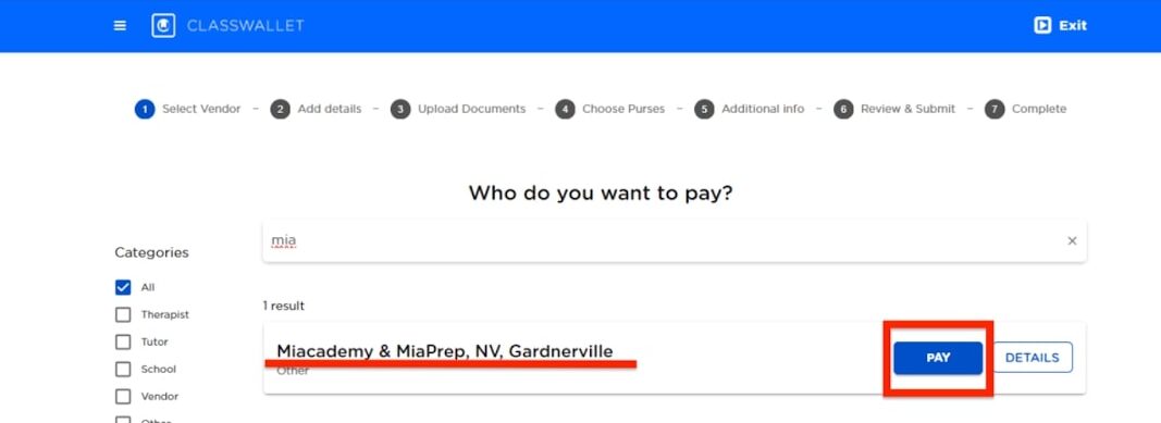 Locate us in the list of vendors, and select the blue “Pay” button.