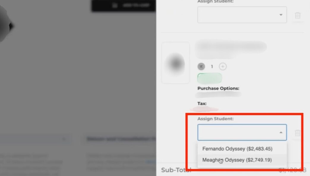 Select the student you’re purchasing for and confirm their available funds when adding your desired membership(s) or workbook(s) to your cart.